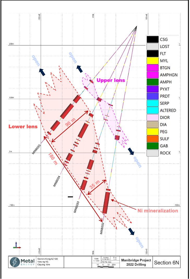 "Drill holes MNB035 and MNB034 contained impressive individual high-grade intersections of 1.19% NiEq over 31.3 m (37.3 GT) and 1.10% NiEq over 28.15 m (31.0 GT), respectively. These four drill holes expand a shallow high-grade nickel zone that was never discovered previously at Manibridge. This particular mineralized zone is 100 m along strike, 40 to 90 m thick, extends for at least 180 m in the dip direction, and is open in both dip directions. The Phase 2 drill program continues to redefine the system at Manibridge with over 1 kilometre of strike, and mineralization down to at least 800 m depth. The broader mineralized envelope is large with multiple high-grade zones being discovered recently. Drilling continues to intersect wide, hide-grade nickel intercepts with similar grade-thickness values ("GT") consistent with what was previously mined at Manibridge. We are planning our Phase 3 drill program to continue the success at Manibridge," said James Sykes, CEO of Metal Energy.