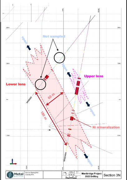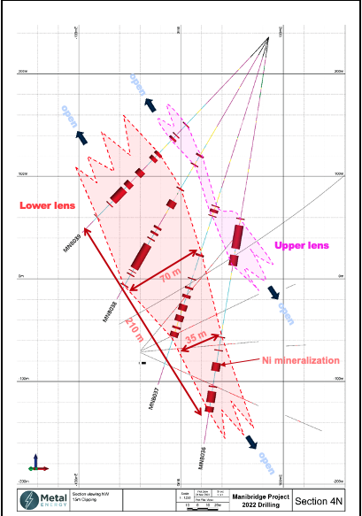 "This new zone of over 1% nickel mineralization in the Upper Lens demonstrates discovery potential for multiple high-grade nickel shoots within the overall mineralized shell at Manibridge. Manibrdige’s mineralized shell is over 1 km of strike, traced down to 800 m depth, and locally exceeds 90 m thickness. Drill holes MNB036, MNB037 and MNB040A show the growth of this new nickel mineralized zone that currently measures 25 m thick by 40 m down-dip. This new zone contains our highest-grade continuous nickel intersection (19.45 m of 1.69% NiEq). We have maintained a 100% Ni-sulphide intersection success rate, and 34 of 36 drill holes have intersected over 1% nickel over variable sample widths. These facts demonstrate the robust nature of the Manibridge nickel system. Overall, we’re thrilled with the results from 2022’s drill programs, and we look to expand and discover additional high-grade nickel mineralization in 2023," said James Sykes, CEO of Metal Energy.