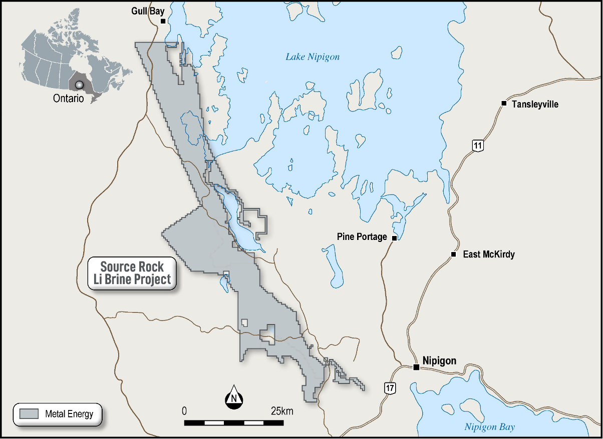 Toronto, Ontario – July 12, 2023- Metal Energy Corp. (the "Company" or "Metal Energy") (TSXV: MERG, OTCQB: MEEEF) is pleased to provide further evidence supporting lithium ("Li") brine prospectivity at the SourceRock project ("SourceRock" or the "Project"), Thunder Bay-Nipigon area of northwestern Ontario (Figure 1).