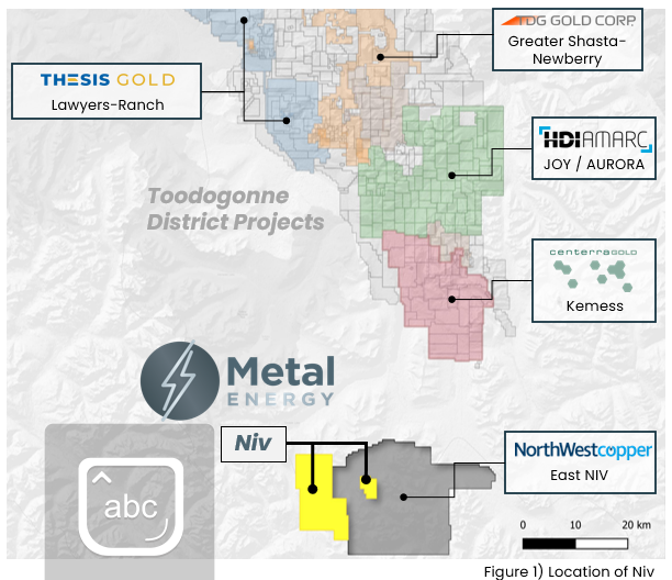 The 12,500-hectare NIV Property lies within the prolific Toodoggone District of north-central British Columbia—approximately 32 km south of Centerra Gold’s Kemess mine complex. The project’s two claim blocks, NIV (1,048 ha) and West NIV (11,500 ha), occupy the same structural and lithological corridor that hosts multiple copper-gold deposits, including those of TDG Gold, Amarc Resources, and Centerra. Nearby, Northwest Copper’s East NIV discovery (0.56% CuEq over 81.6 m) underscores the fertility of the broader system.